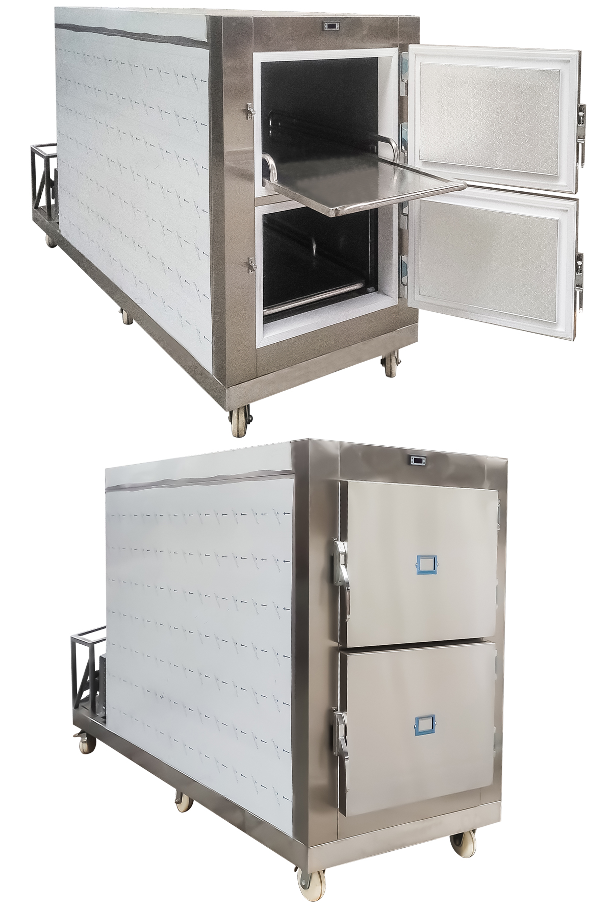 Accommodates up to two bodies on stainless steel trays, providing organized and hygienic storage.