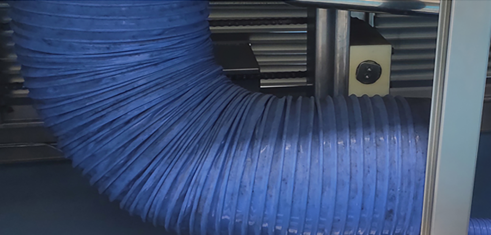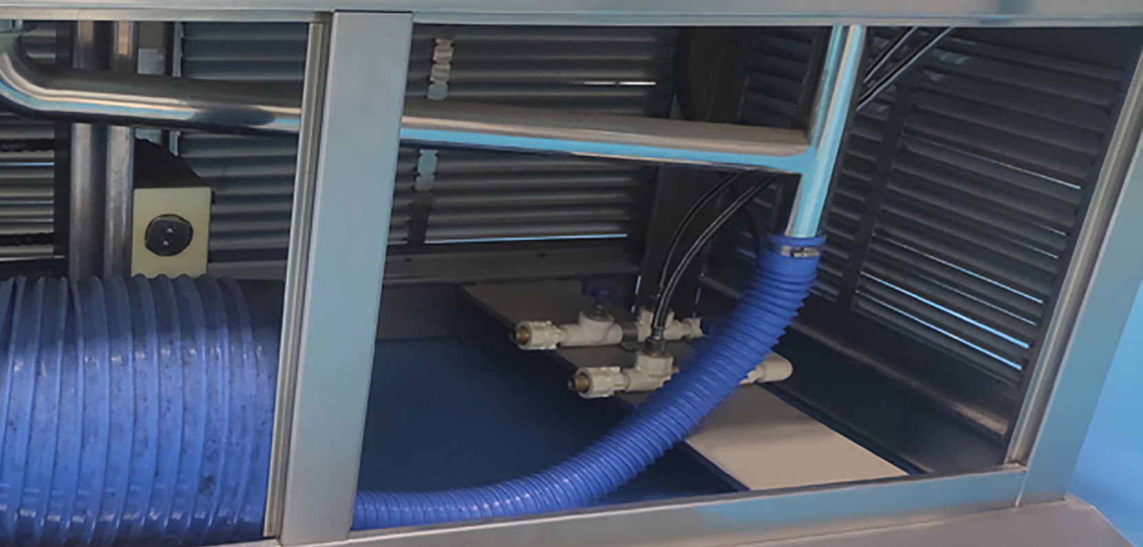 Below the dissection table (covered by a stainless steel fence plate), equipped with a large diameter nylon duct to extract odors and send fresh air to the room to reduce odors and toxic gases emitted in the autopsy room.