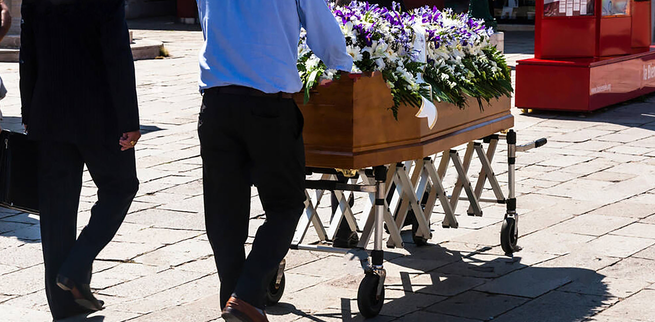 This image depicts the on-site application of a coffin trolley provided by our client. Following the church ceremony, staff members escort the trolley directly to the cemetery installation site.
